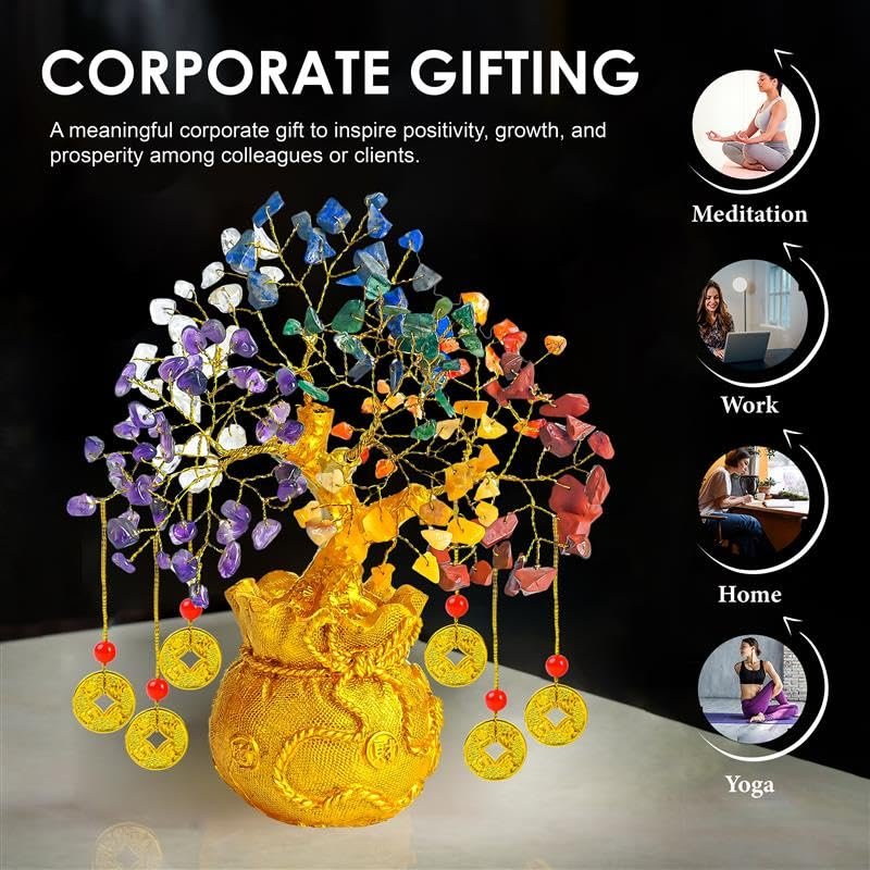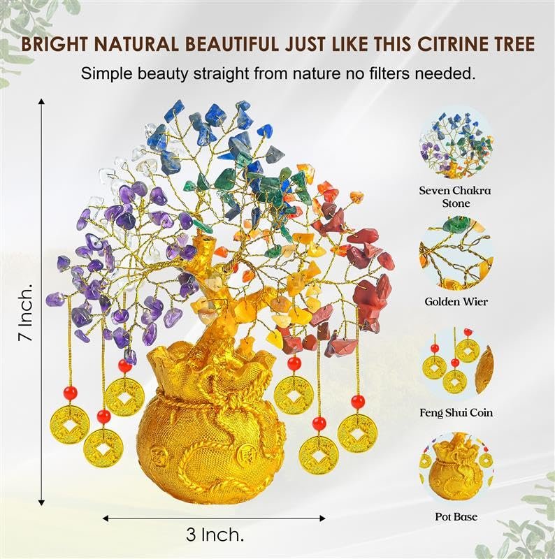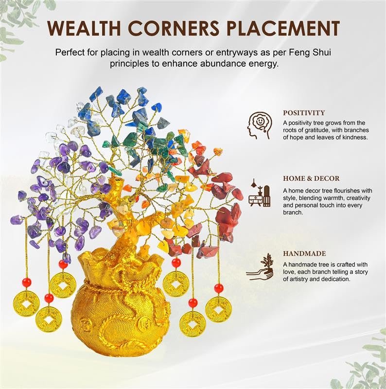 Crocon Seven Chakra Tree of Life – Crystal Healing Bonsai Tree with 6 Feng Shui Coins & Potli Base – Chakra Tree Crystal for Reiki, Meditation, Energy Balance – Gift for Women
