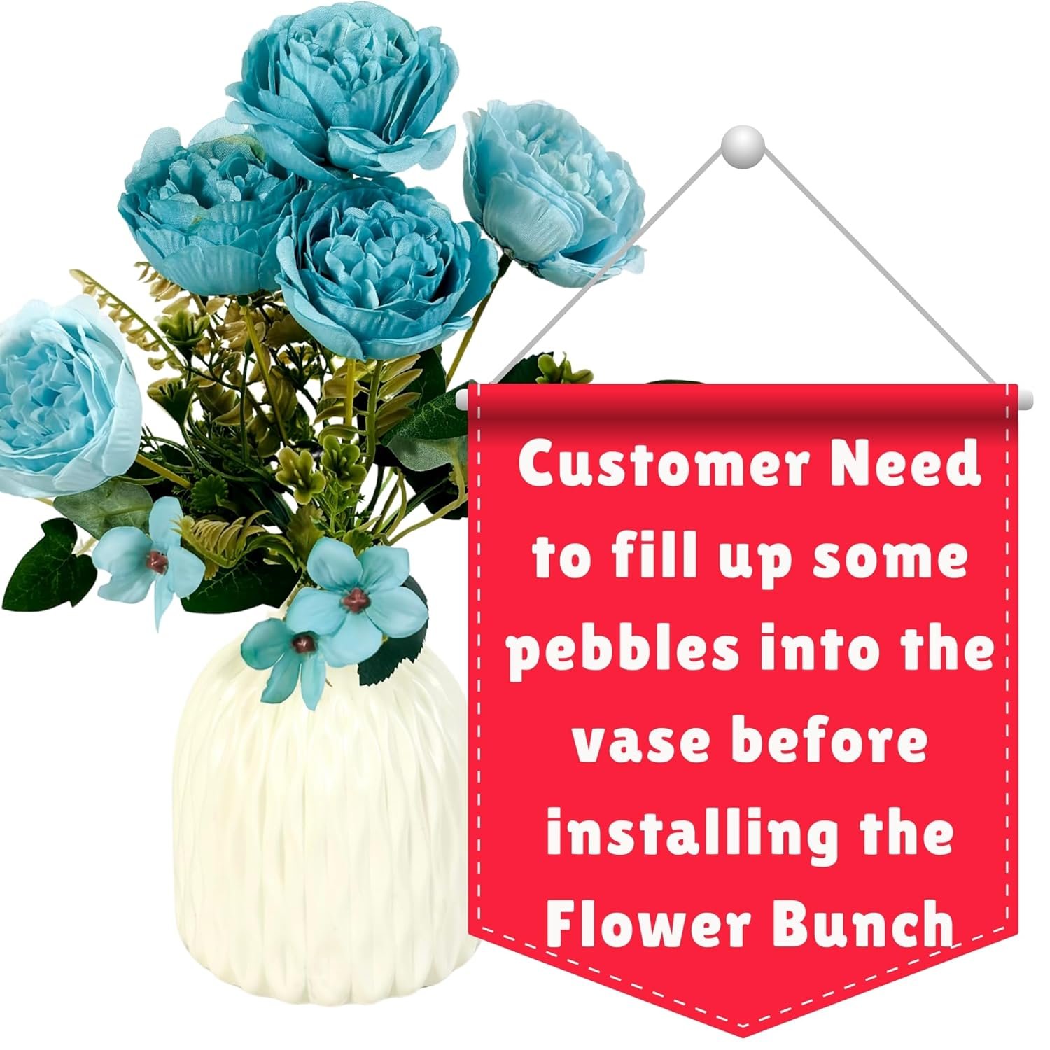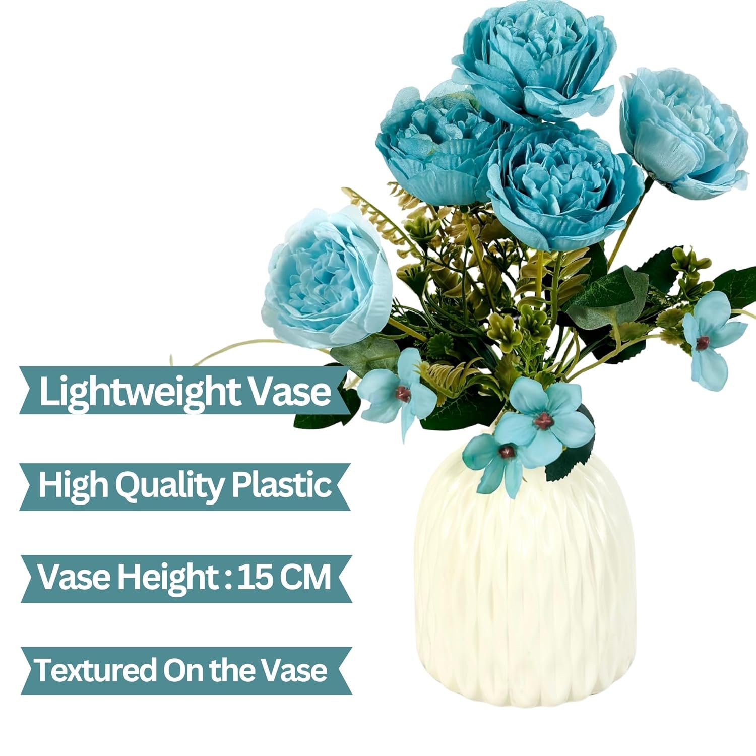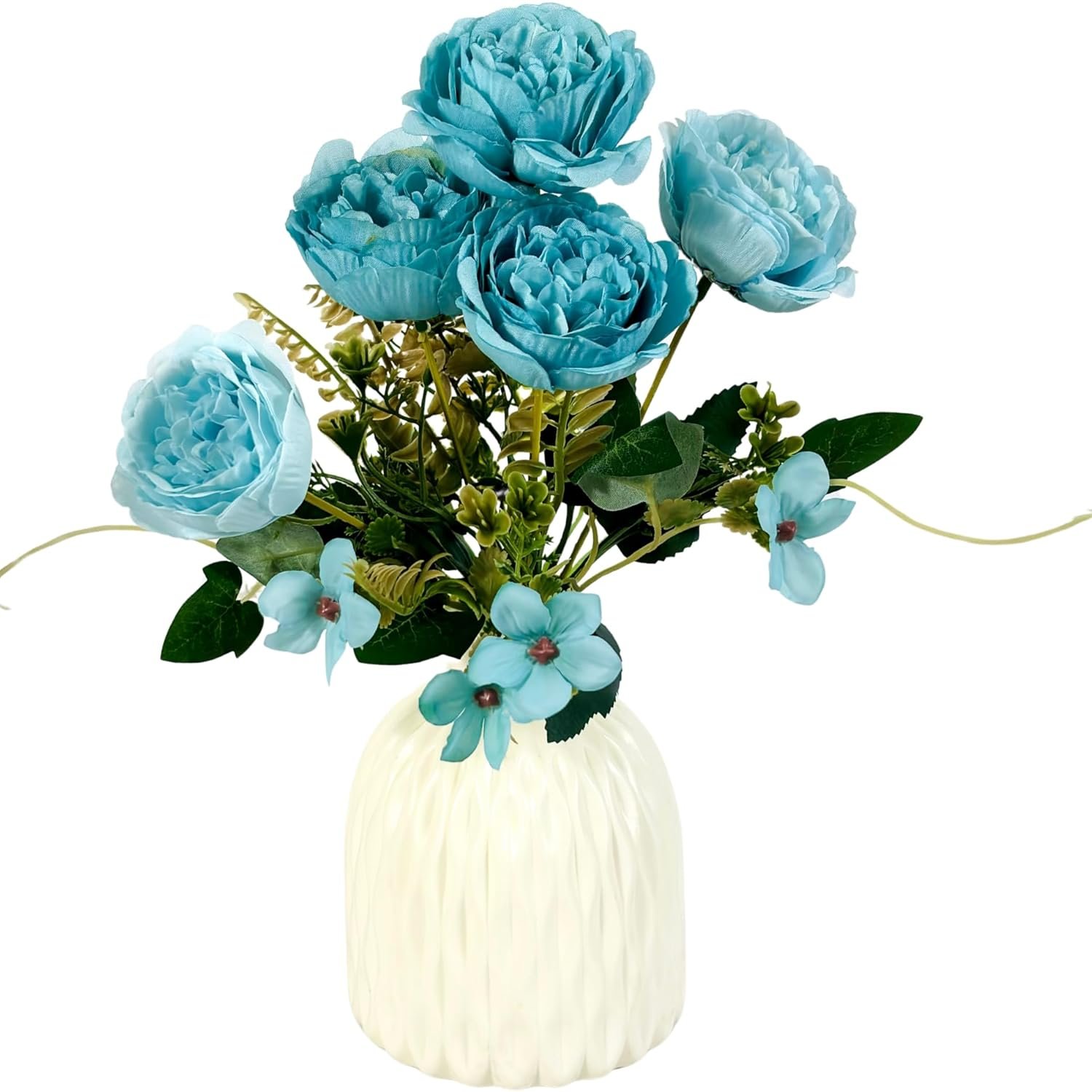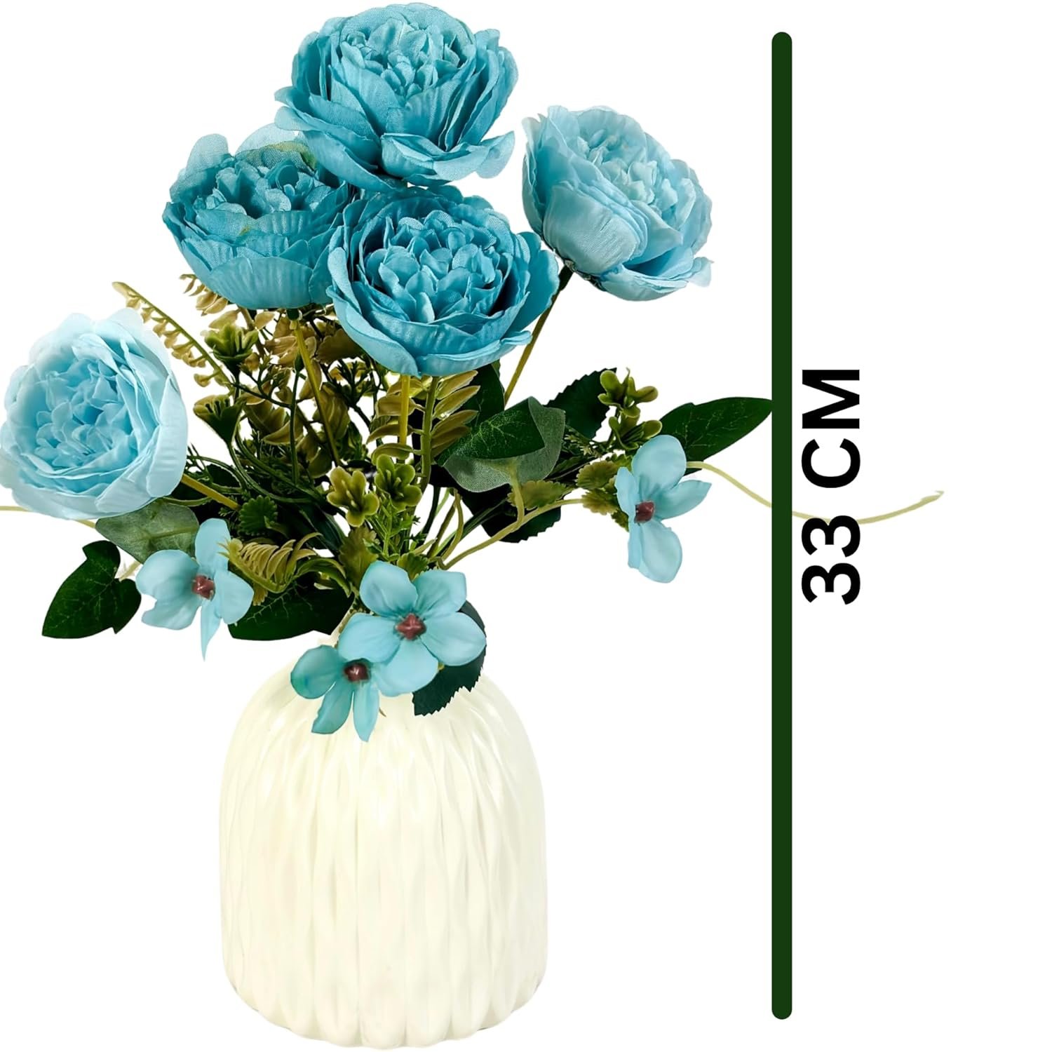 Dekorly Artificial Peony Flowers Bunch | White Vase with Flowers Bunch | Artificial Plants for Home Office Hotel Decor | Bedroom Living Room Bathroom Decor (Blue, Height : 30CM)