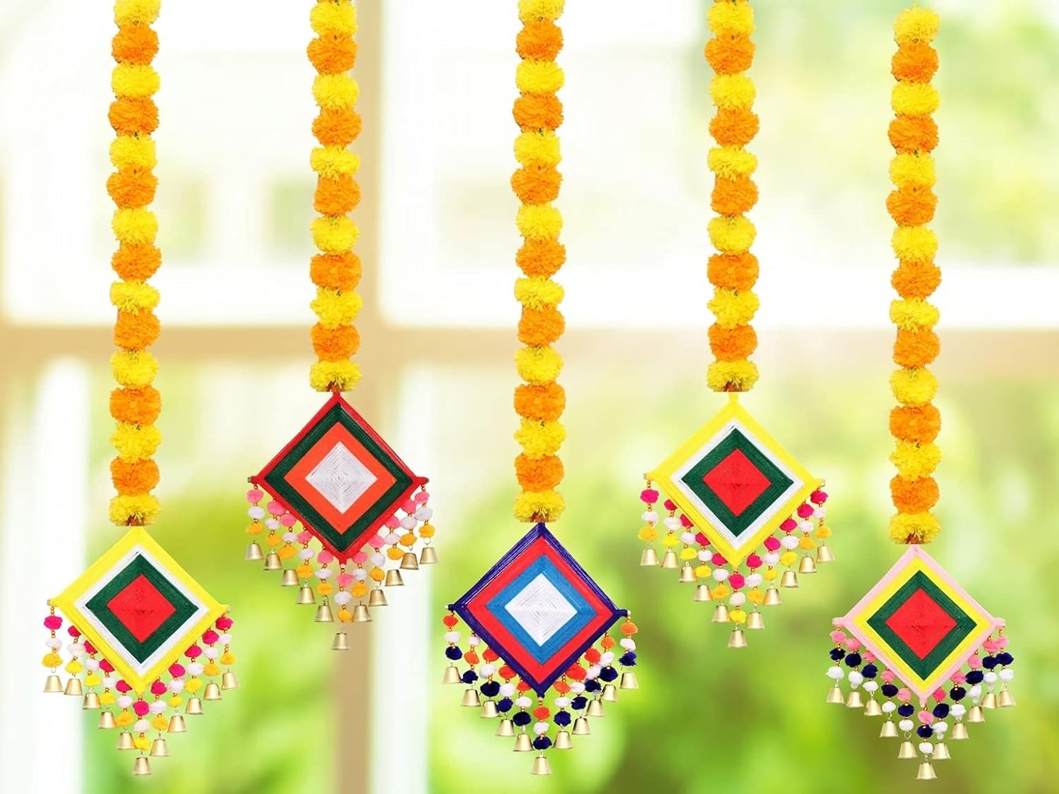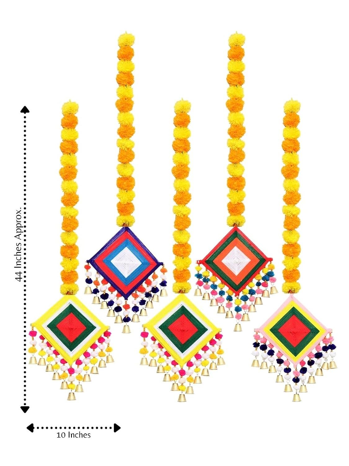 JH Gallery Handmade Artificial Marigold Fluffy Flowers Colorful Woolen Kite Bells Hanging (44 Inches Height Approx. Pack of 5)